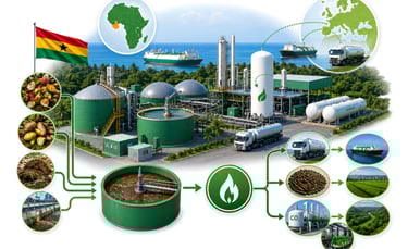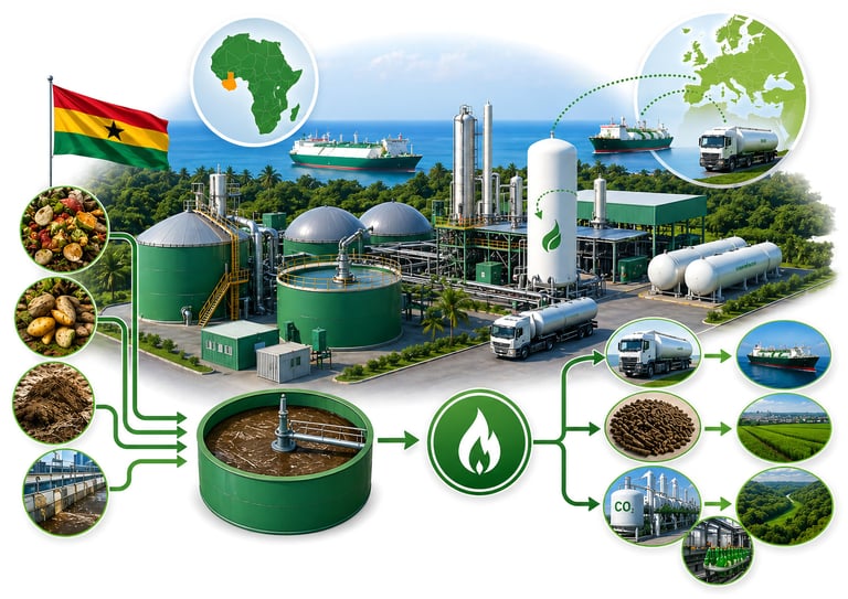 The plant is sited in Ghana, West Africa and targets European bioLNG markets (trucking and maritime), regional or export fertilizer markets, and Beverage /industrial CO₂ users or sequestration markets.